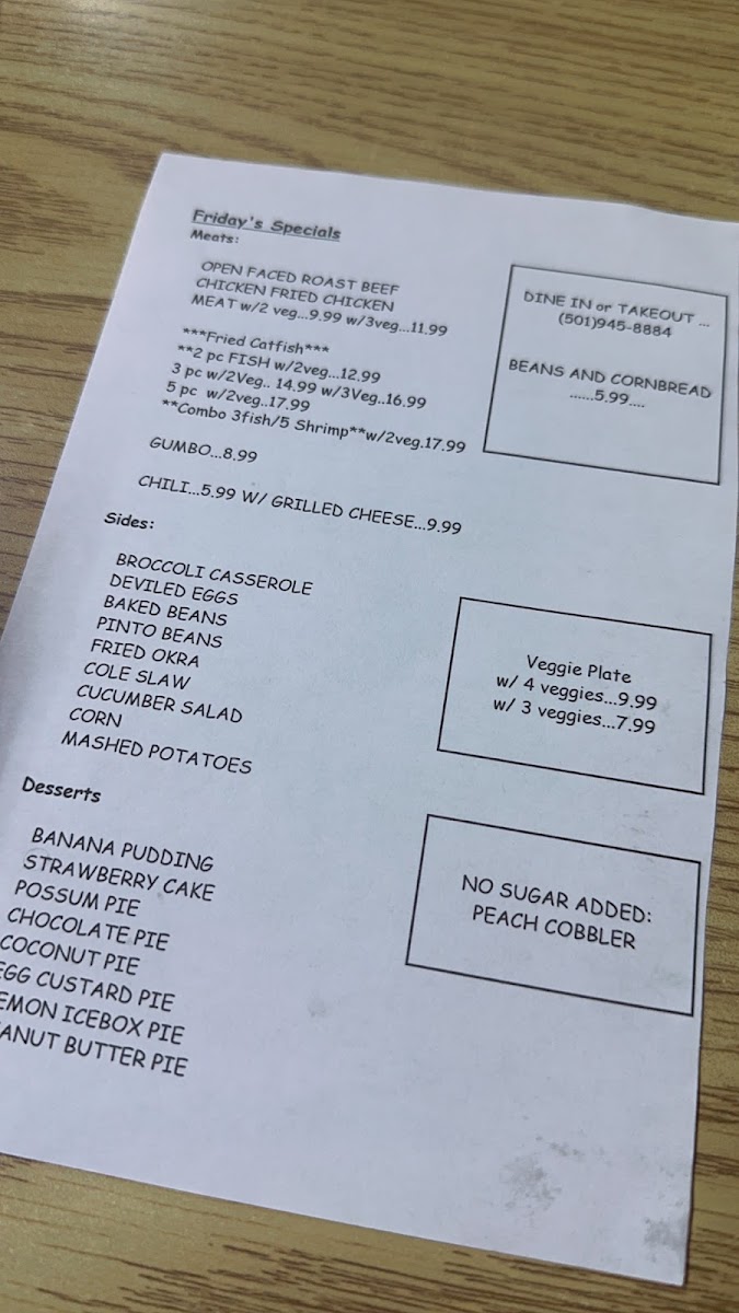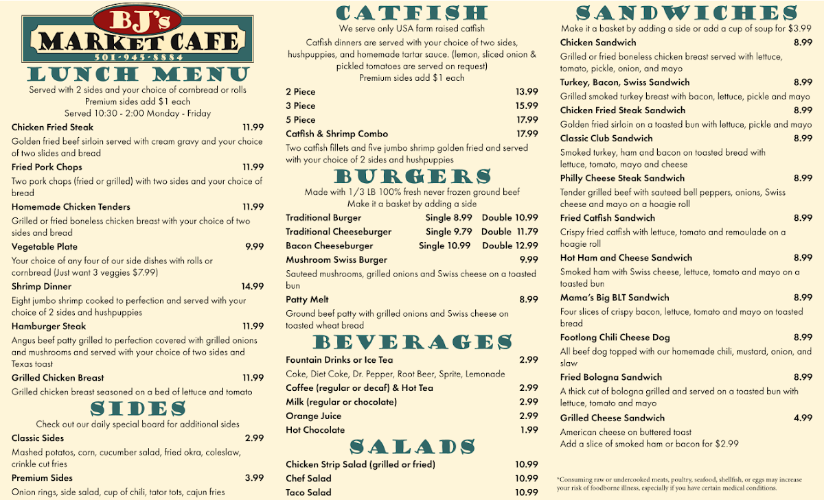 5 piece farm raised fresh water catfish fillets fried in our special cornmeal breading and served with hushpuppys, fries and cole slaw